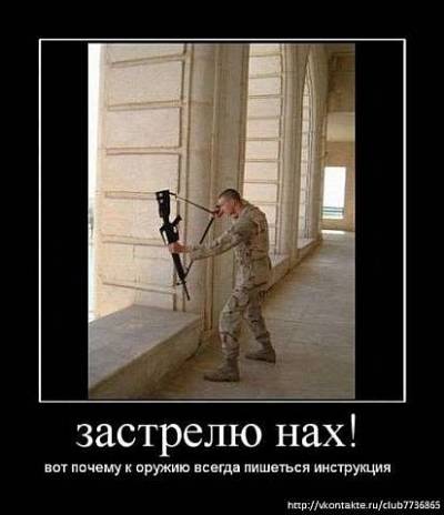 |  Добавлено (03.02.2011, 20:17) --------------------------------------------- Тогда наши дальние стратегические бомбардировщики Ту-95 регулярно кружили вокруг Кубы и делали аэрофотосъемку всего что можно. Кстати, американцы в этом районе держали свои боевые корабли, в том числе и несколько авианосцев. Так вот, летит над океаном один Ту-95 (к слову, кто не знает что такоеТу-95: это огромадная махина, с размахом крыльев около 85 метров, пошире, чем палуба авианосца, с 4-мя здоровыми двигателями и 8-ю 3-х метровыми винтами), летит никого не трогает, и подлетает к нему сбоку американский перехватчик (просто по курсу Ту-95-того находился авианосец штатов). Пилот знаками показал "открой бомболюк" (мало ли, вдруг у тушки там бомба и он летит потопить его аэродром). Наши летчики открыли ему бомболюк. Пилот подлетел снизу, увидев что ничего кроме фотоаппаратуры там нет, успокоился. Опять поравнявшись с тушкой, он улыбался, подмигивал, а потом показал брюхо своего самолета вместе с ракетами воздух-воздух, на что тушка грозно повертела своими 8-ю пушками (обмен любезностями, так сказать). Но пилот не успокоился и решил пошутить, он показал команду "садись". Наши переспросили: - "садиться"!? - "Yes!" - "на авианосец"!? - "Yes!" - "Ок" - сказали русские и на подлете к авианосцу пошли на посадку. Но как они пошли на посадку?.. Снизили высоту и скорость, выдвинули все свои закрылки и прикрылки, задрали нос. Даже выпустили шасси! Так американские матросы, увидев, что сейчас на них сядет эта махина и от палубы, самолетов, людей и построек оставит одну палубу, начали прыгать в воду!! А высота малоприятная - примерно с 9-ти этажный дом. Наши конечно не сели, а в последний момент свернули в сторону и летели на минимальной высоте, чтобы скрыться от вражеских локаторов. Как говорят очевидцы на аэродроме, после приземления, наши летчики от смеха буквально вываливались из самолета."